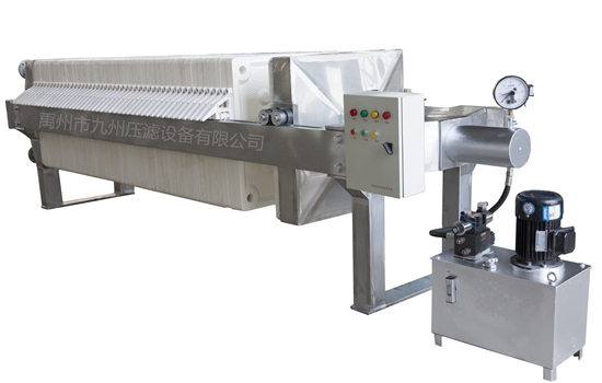 懸浮液用料泵送入濾機每個密閉的濾室,在壓力作用下,濾液透過濾層及濾布,經濾布出液口排出,濾渣則留在濾框內,從而達到固液分離的目的。